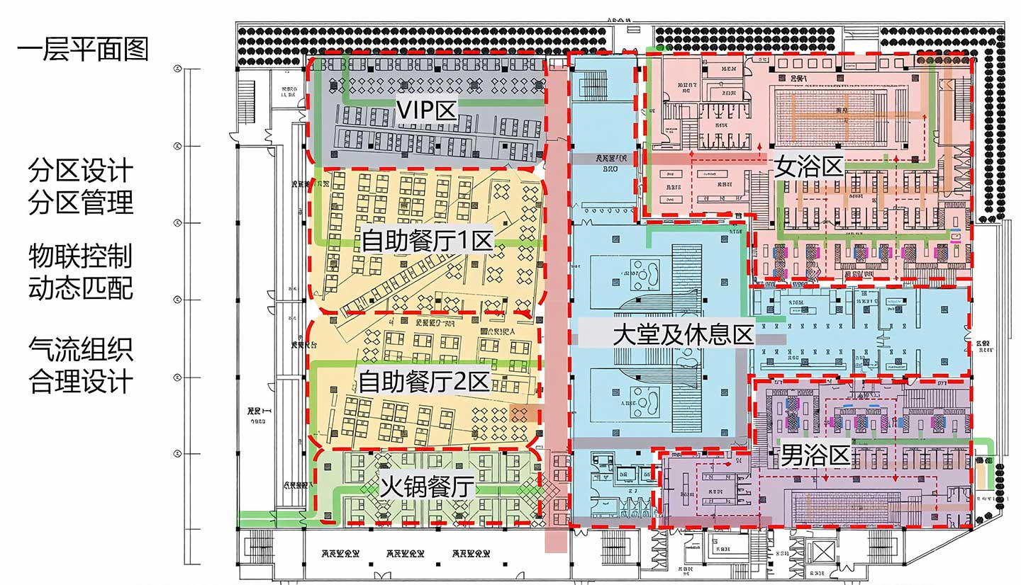 结合各功能区特性,定制化设计气流组织方案,确保空气流通充分、舒适无死角,为用户营造清爽宜人的空间环境。