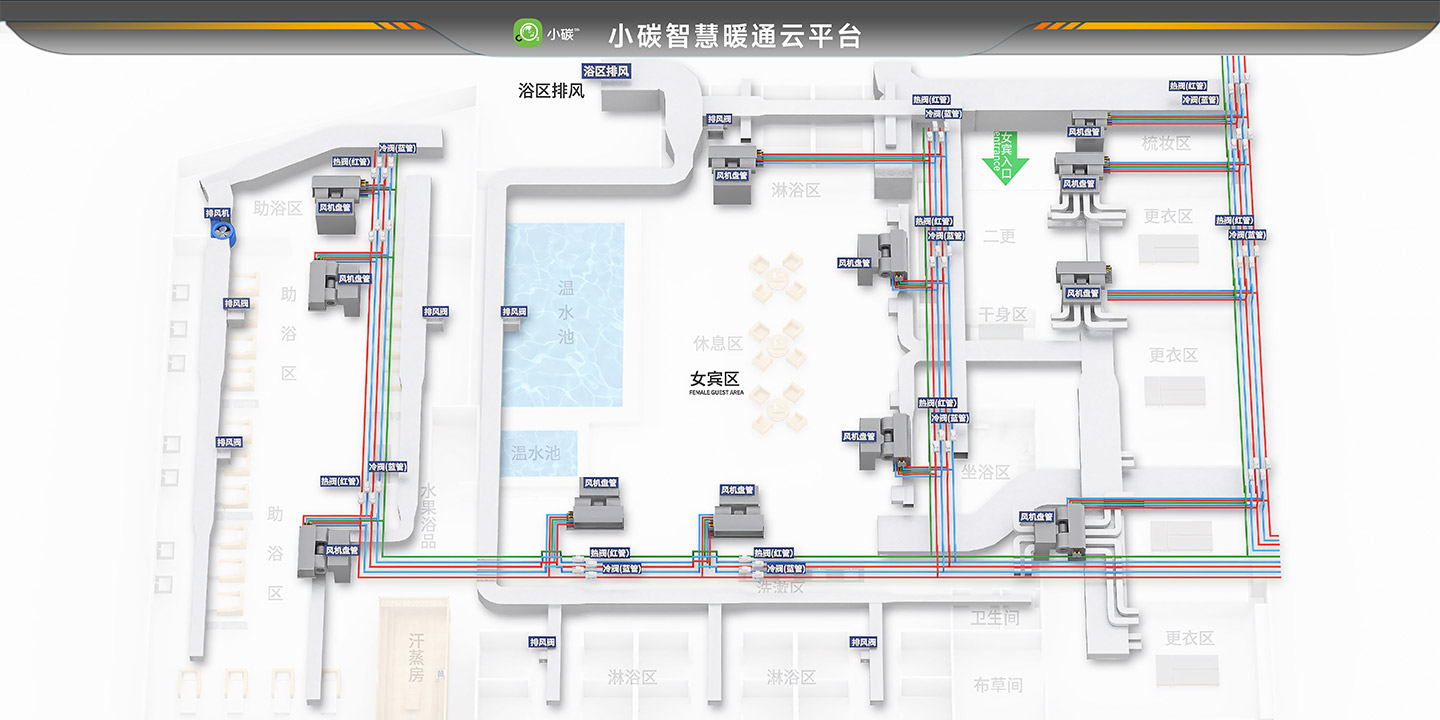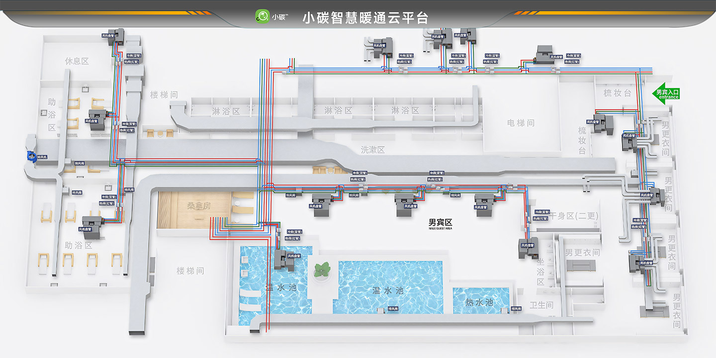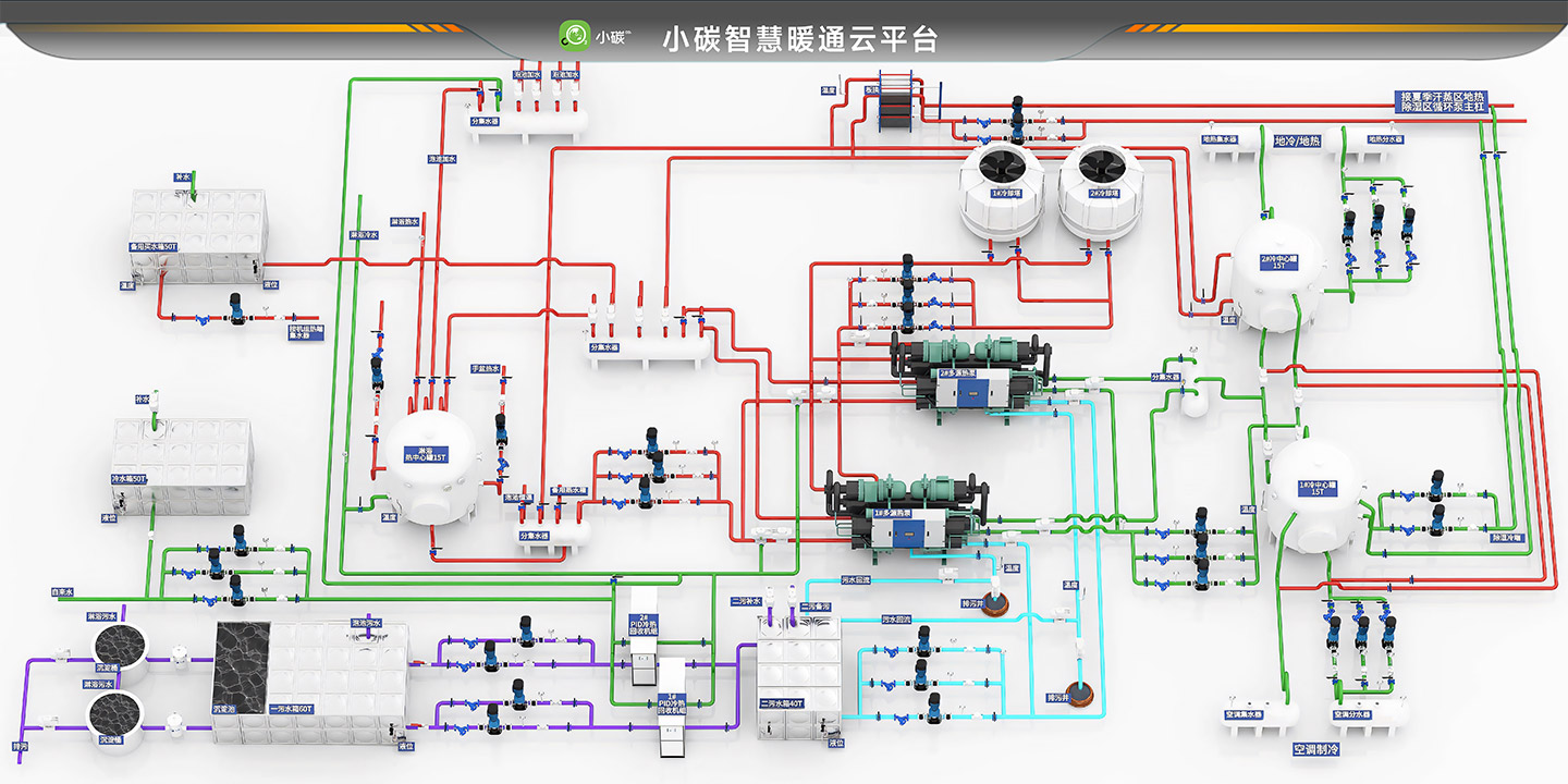 项目需求:●淋浴热水 ●泡池恒温 ●新风 ●设备间分区温度管理 ●全自动化 ●物联网智控 ●供暖 ●空调制冷